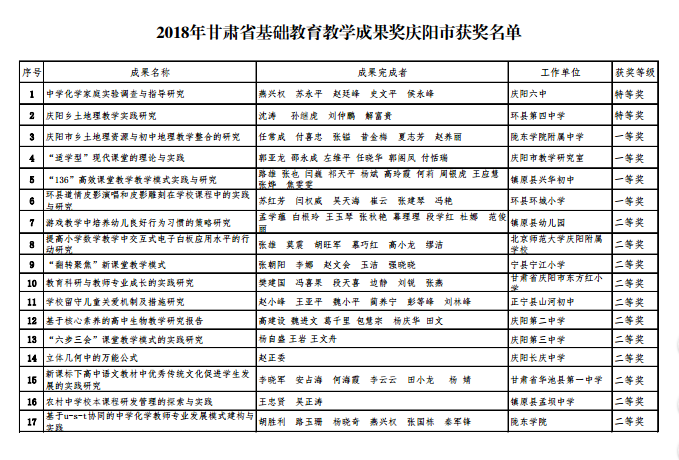 ????2018年8月7日,甘肅省人力資源和社會保障廳、甘肅省教育廳以甘人社廳發(2018)32號文件,公布了2018年甘肅省基礎教育教學成果獎評獎結果。我市17項成果獲獎,其中特等獎2項,一等獎4項,二等獎11項。這是我市在歷次省級教學成果評獎中獲獎最多的一次。