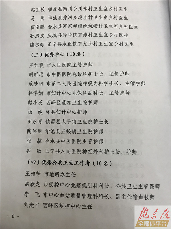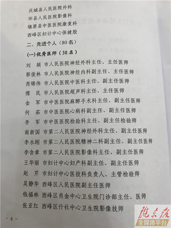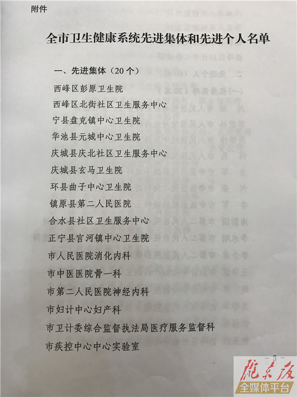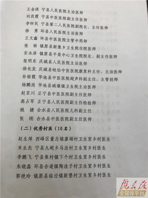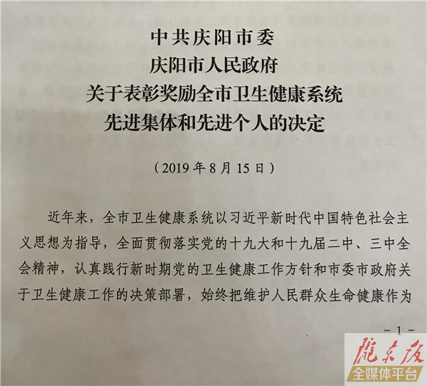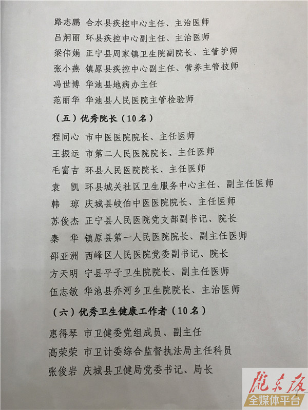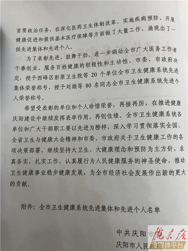 ??? 慶陽網訊 (記者 李彬)8月16日,慶陽市慶祝第二個中國醫師節表彰大會暨醫改工作推進會議在慶陽賓館會議禮堂召開。會上,表彰獎勵了全市衛生健康系統20個先進集體和80名先進個人,名單如下: