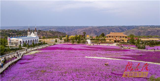 寧縣義渠百花園芝櫻花海航拍全貌(2020年4月29日攝)。記者?陳飛?攝? ?