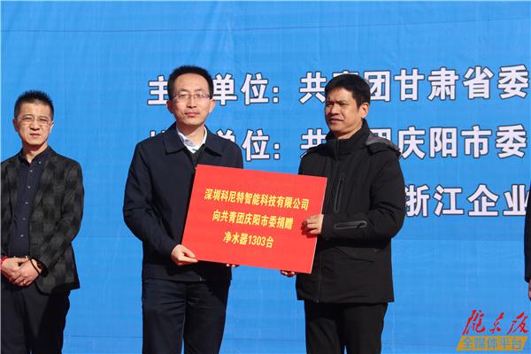 啟動儀式上,深圳科尼特智能科技有限公司向全省11772個行政村捐贈安裝凈水機11772臺、濾芯11.77萬根。其中,為慶陽市捐贈安裝凈水機1303臺,為合水縣捐贈安裝凈水機122臺、熱水器122臺。