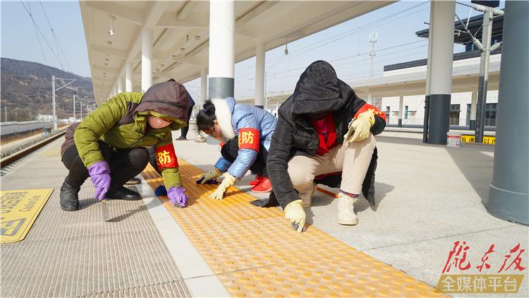 ????慶陽網訊(記者 路世玲) “來,姐妹們,咱們動作麻利點,把活干得漂亮些。”12月17日,在銀西高鐵寧縣站4號站臺,一名中等身材、容貌清秀的女子帶領著七八個女保潔員用清潔工具正在認真地擦拭和打掃站臺黃色候車區域衛生。