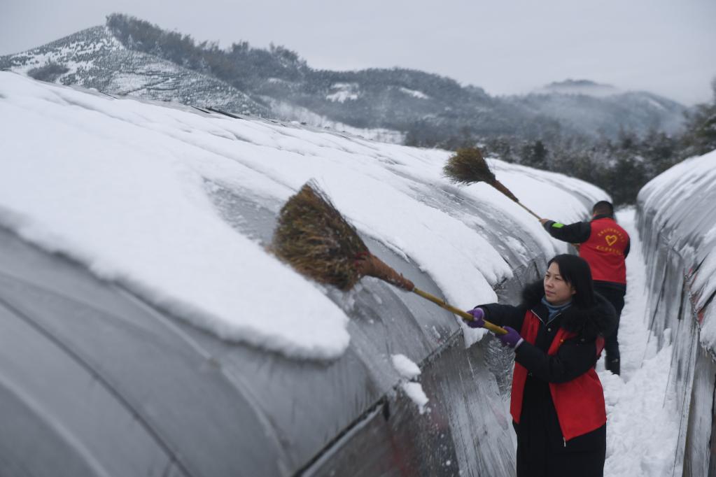 2月7日,杭州市臨安區(qū)太湖源鎮(zhèn)的黨員志愿者在蔬菜基地幫助農(nóng)戶清理大棚上的積雪。新華社記者 徐昱 攝