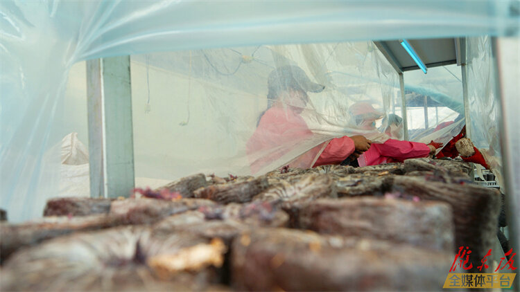 ▲工人檢查菌棒。本報記者 路世玲攝