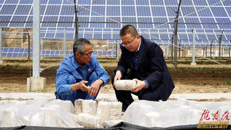 ▲慶陽雙升農業開發有限公司技術總監梁啟文(左)與華池縣工作人員查看菌棒。本報記者 路世玲攝