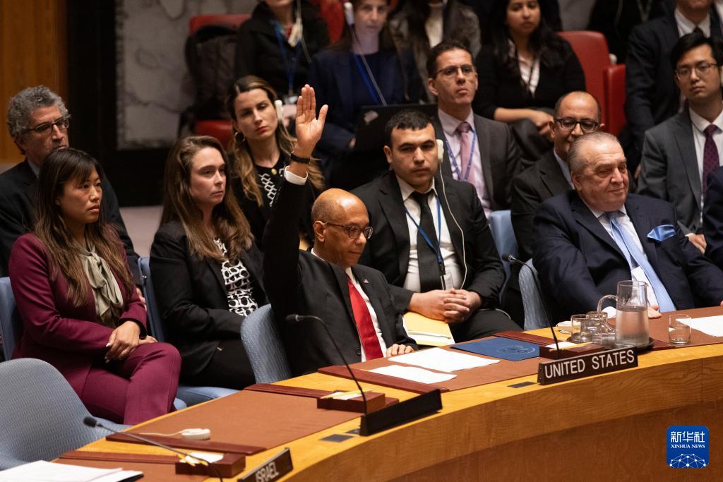 4月18日,在位于紐約的聯合國總部,美國常駐聯合國副代表羅伯特·伍德(前左)在安理會就決議草案進行表決時投反對票。新華社記者 謝鍔 攝