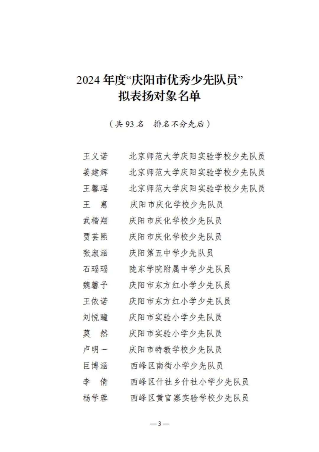 2024年度“慶陽市優秀少先隊員”擬表揚對象名單
