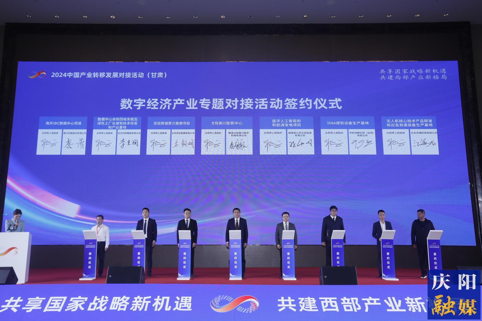 中國信通院黨委副書記王曉麗,省工信廳副廳長黃寶榮,絲綢之路信息港股份有限公司黨委副書記、總經(jīng)理趙四輩,中國能建西北區(qū)域總部黨委書記、總經(jīng)理徐剛,甘肅政法大學(xué)黨委常委、紀委書記焦愛勝等出席。慶陽市委常委、常務(wù)副市長劉長發(fā)主持活動,副市長張平宗代表慶陽市政府與企業(yè)簽約,現(xiàn)場簽約項目14個、簽約額111.45億元。在當(dāng)天上午舉行2024中國產(chǎn)業(yè)轉(zhuǎn)移發(fā)展對接活動(甘肅)開幕式上,慶陽市還現(xiàn)場簽約項目2個,簽約額611億元。