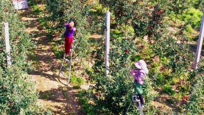 采摘基地里,人頭攢動,采摘工人們爬上爬下,忙著采摘;蘋果樹行道之間,運輸蘋果的拖拉機隆隆作響,來回穿梭;而距離蘋果基地十余公里外的蘋果倉儲分揀車間里,更是一番繁忙景象。