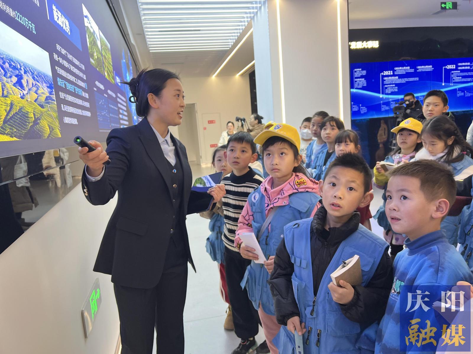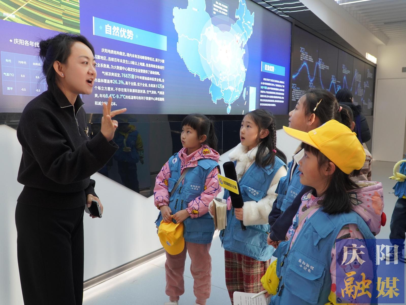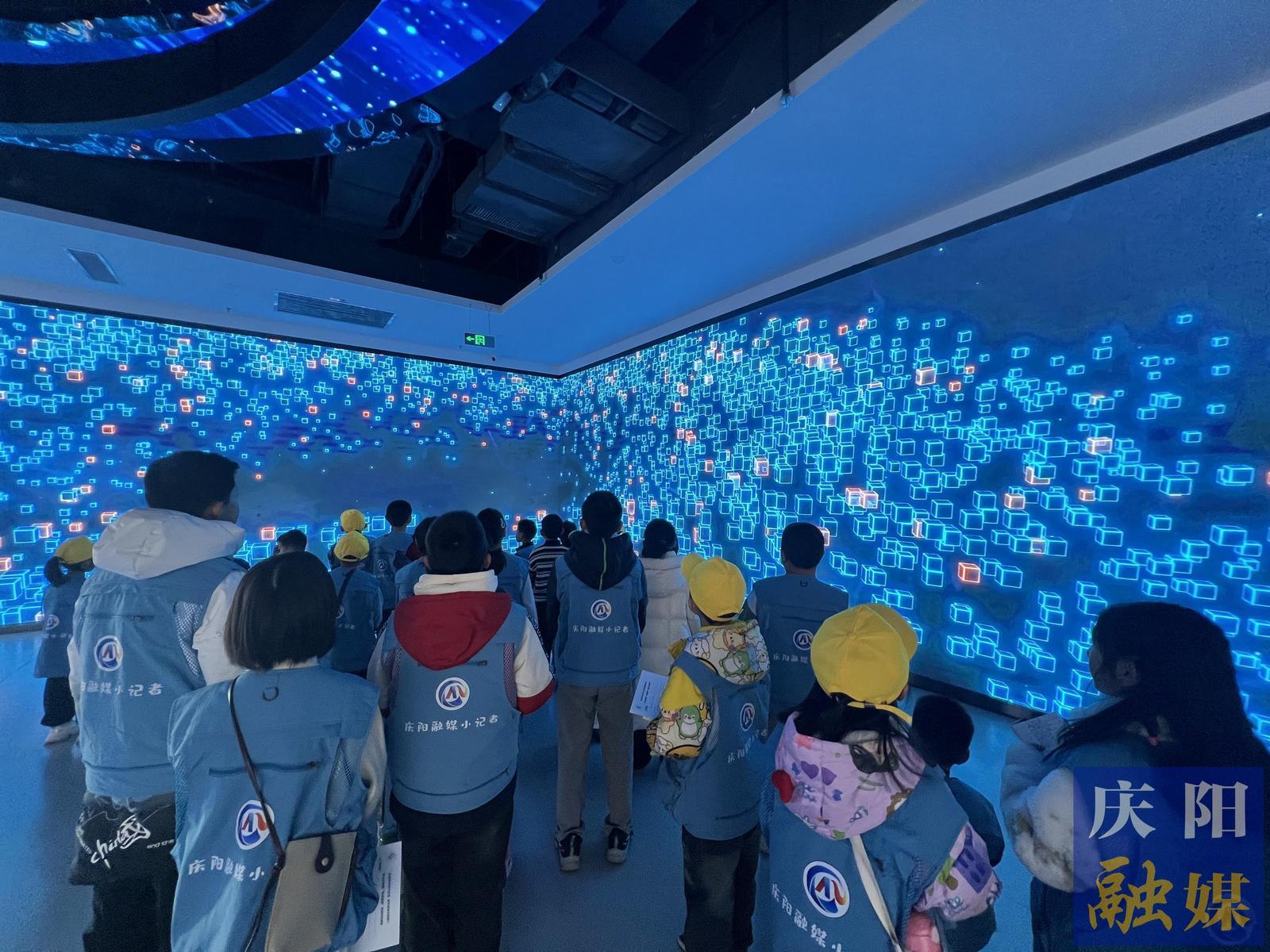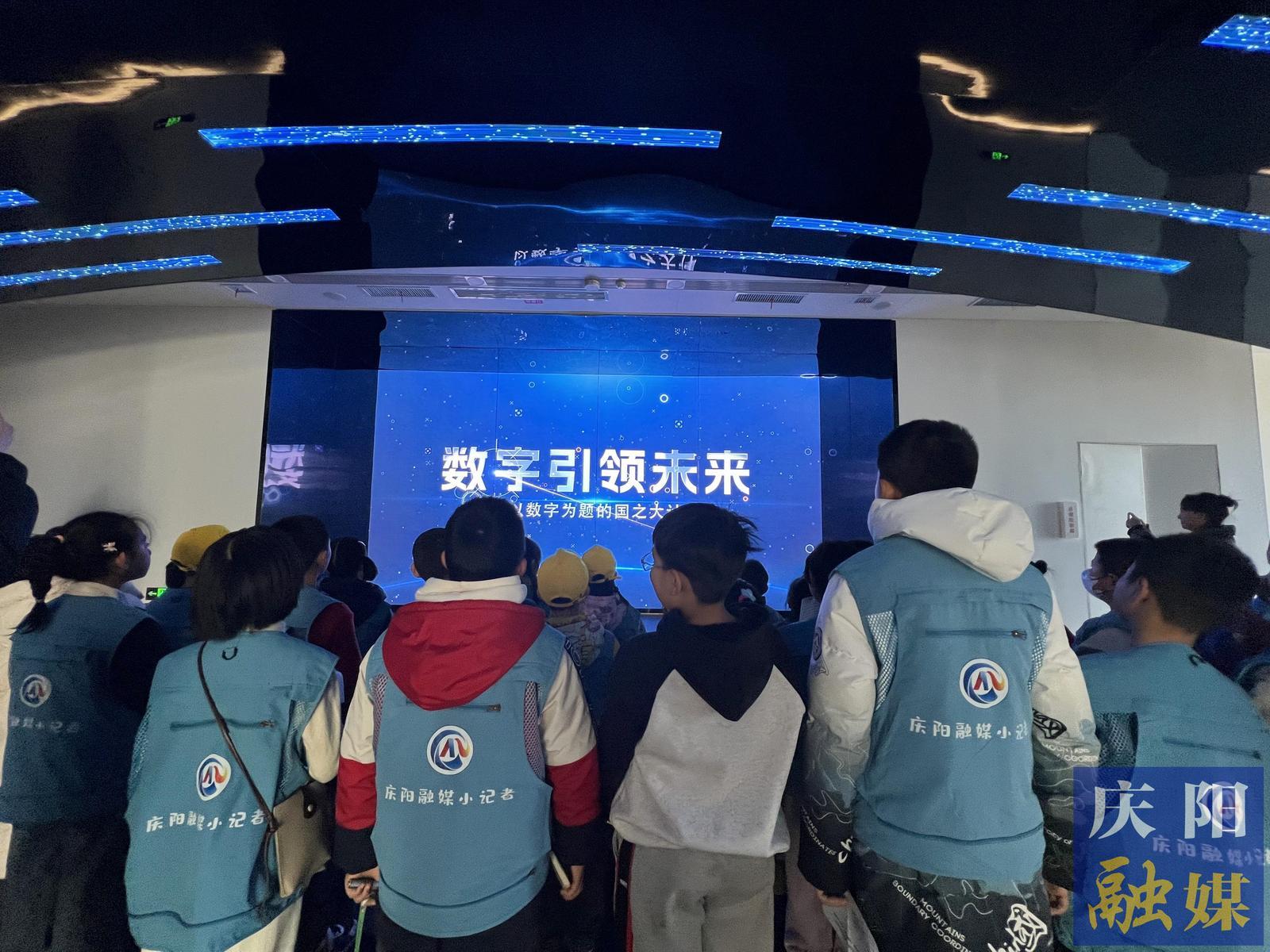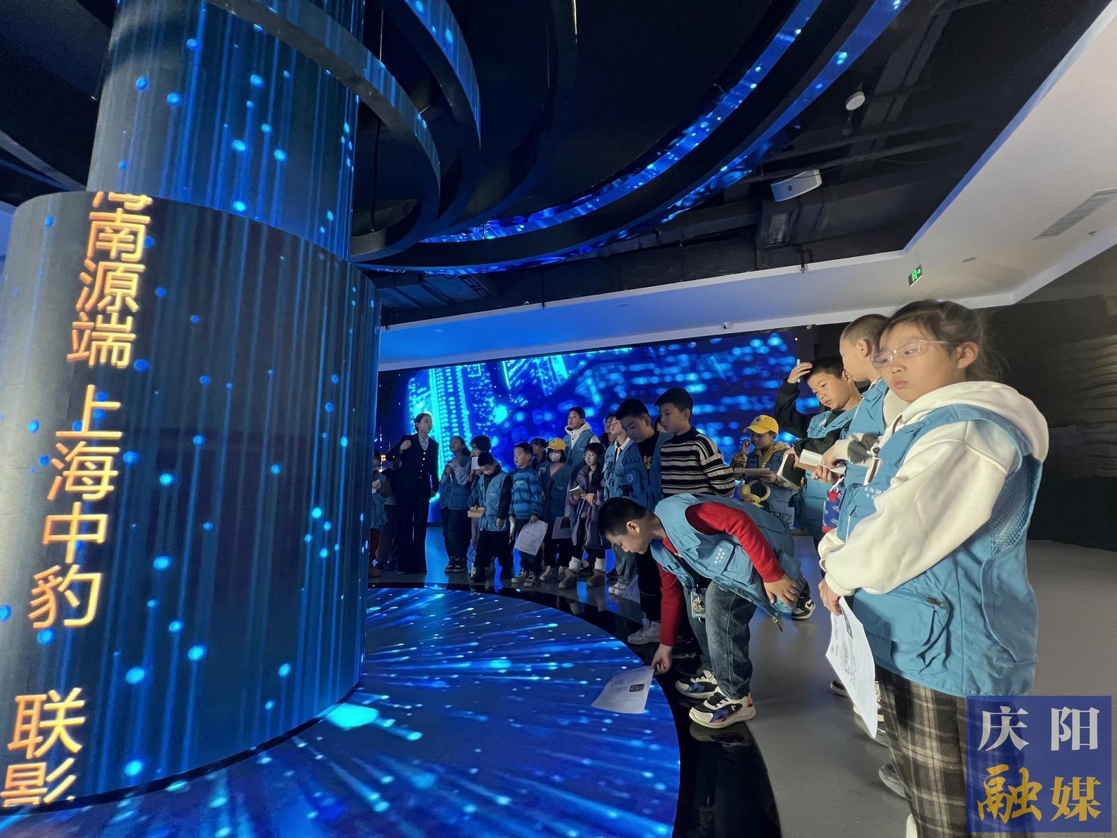 在慶陽(yáng)云創(chuàng)公司講解員李肖肖的帶領(lǐng)下,小記者們踏入了這個(gè)充滿科技感的展示空間。一進(jìn)門,一幅巨大的數(shù)字畫卷映入眼簾,生動(dòng)展現(xiàn)了慶陽(yáng)市近年來(lái)在“東數(shù)西算”工程中的最新成果和亮點(diǎn)。小記者們紛紛駐足,用好奇的目光審視著這片數(shù)字世界的“新大陸”。