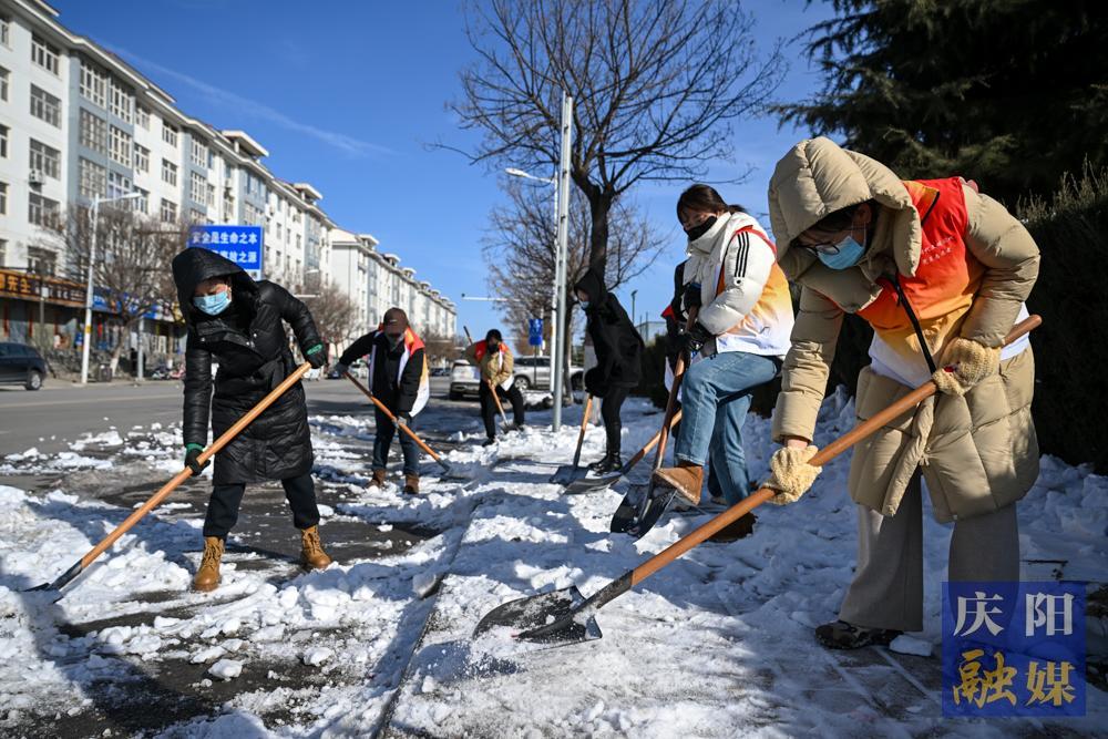 西峰區(qū)合水東路社區(qū)工作者清除轄區(qū)內(nèi)道路積雪。