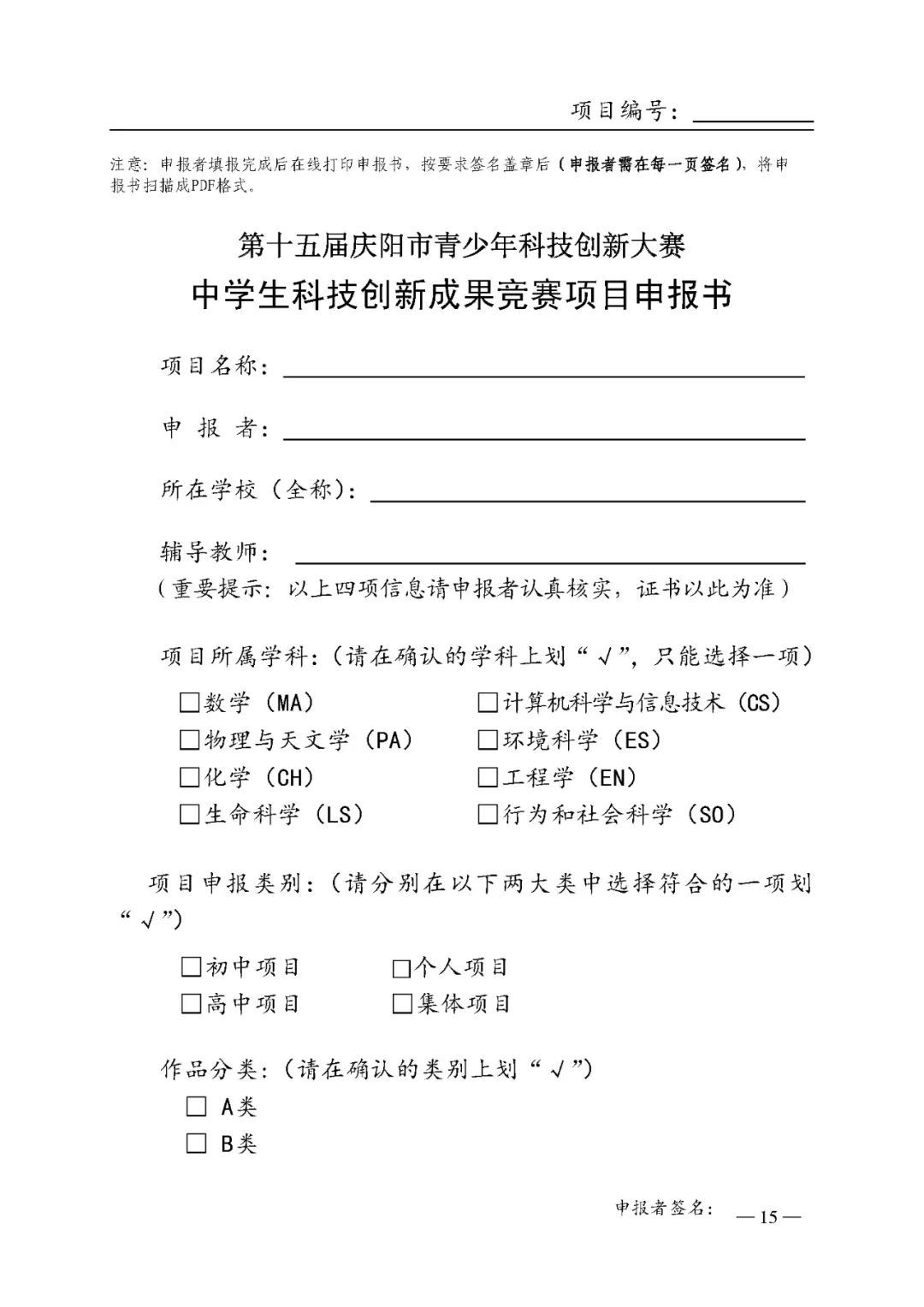 2.第十五屆慶陽市青少年科技創新大賽申報書