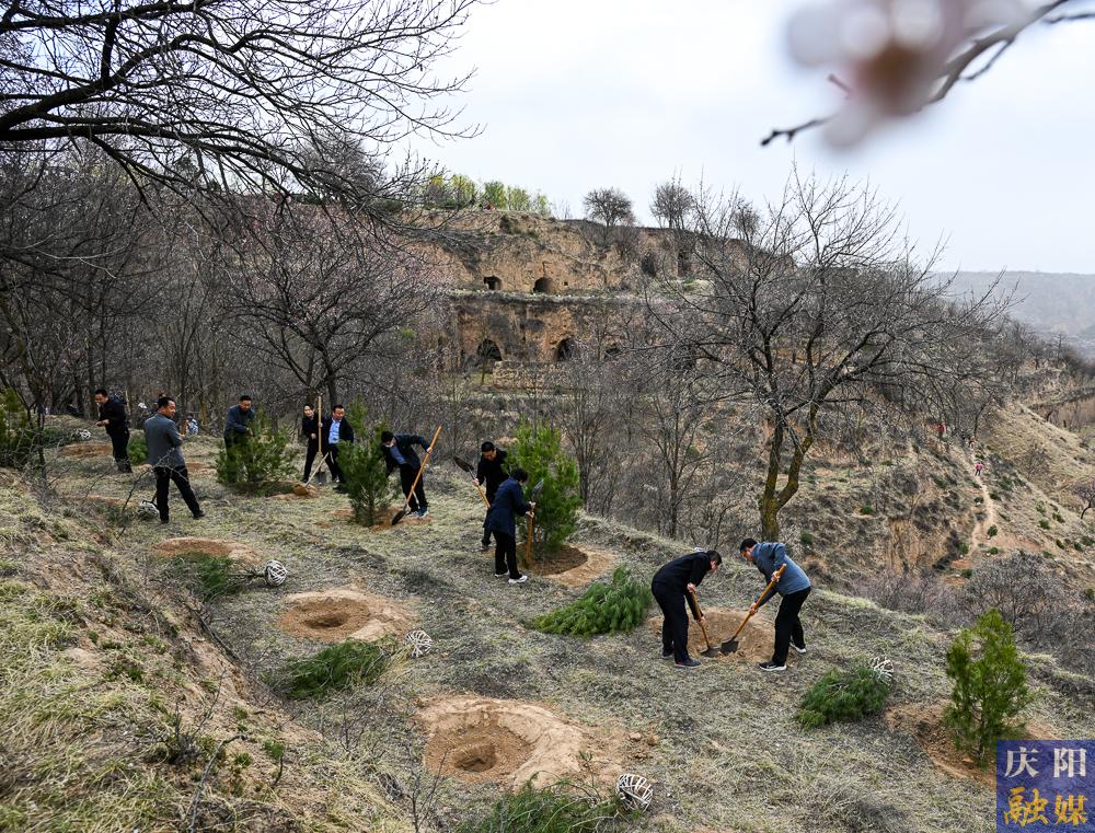 干部職工在西峰區后官寨鎮路堡村開展義務植樹活動。
