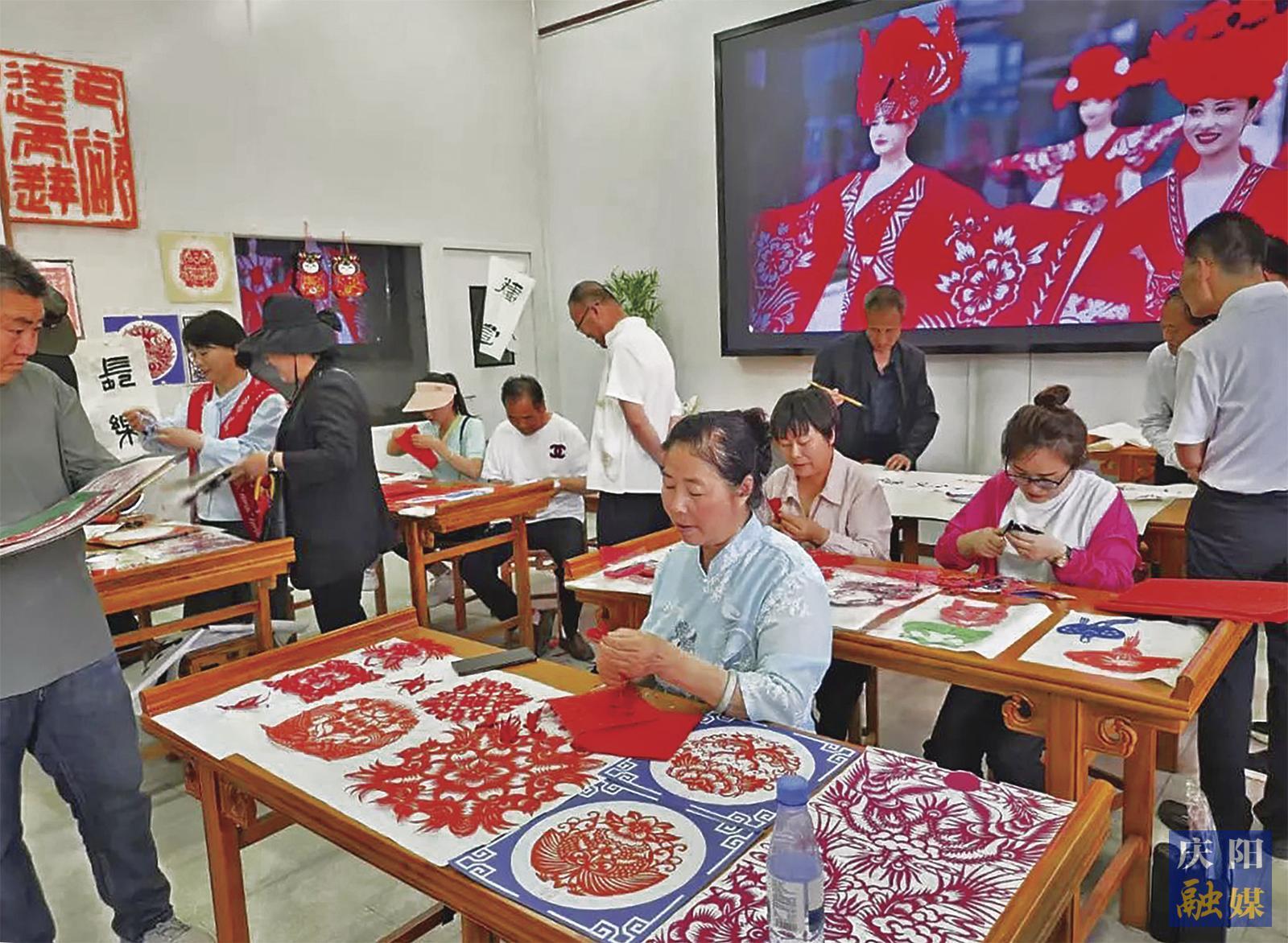 鎮原縣非遺傳承人向群眾展示剪紙技藝。