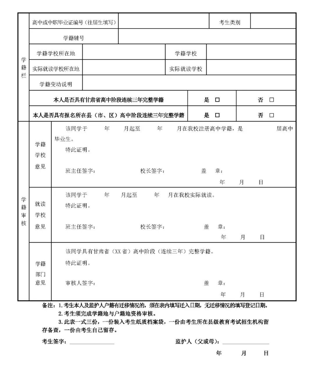 3.在外省就讀的考生還須具有外省學(xué)籍所在地教育考試招生機構(gòu)出具的不能參加當?shù)仄胀ǜ呖嫉淖C明或相關(guān)函件(附件 5),并持相關(guān)人員戶籍、學(xué)籍所在地教育行政部門出具的學(xué)籍、學(xué)業(yè)水平合格考考試成績證明及綜合評價信息等材料,并簽訂《外省接受高中階段教育考生參加甘肅省普通高考報名誠信承諾書》(附件 6)。