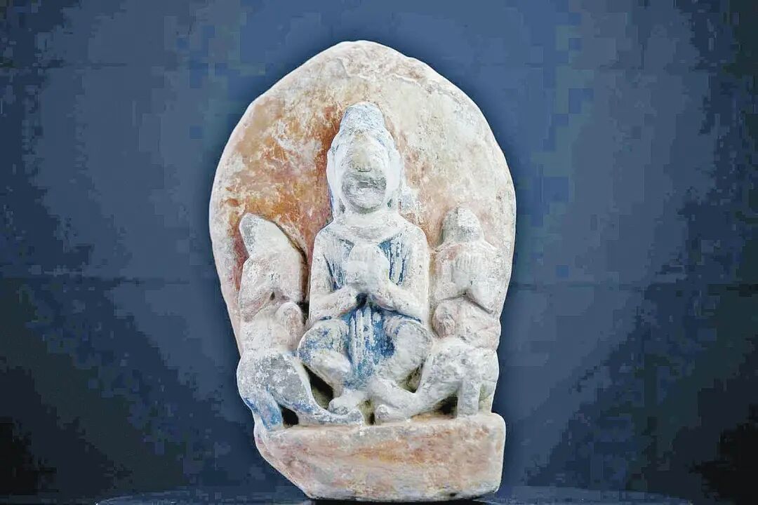 收藏單位:隴東古石刻藝術博物館 高螺髻,面殘,身披圓領袈裟,下著裙,交腳趺坐平臺上。手執法器,二脅侍騎象,面向左,一手撫胸,一手結印,通體彩繪。