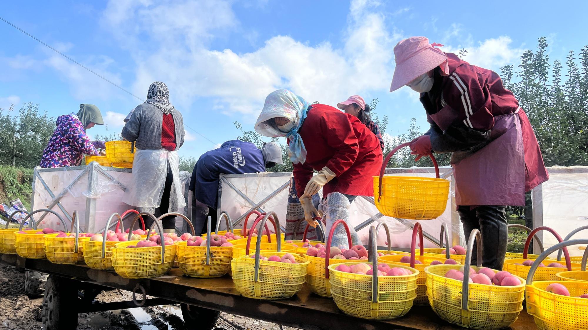 慶陽春滿園種植養殖農民專業合作社工人分揀蘋果(程娟娟 攝)