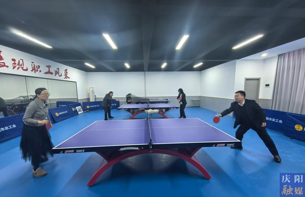 職工在乒乓球室打球。