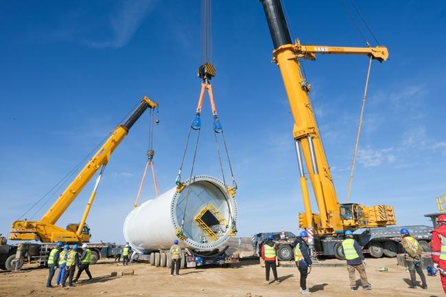 12月14日,隨著最后一個葉片和輪轂在空中完成精準對接,由中建六局承建的甘肅慶陽“東數西算”產業園區綠電聚合試點項目首臺6.7兆瓦風電機組在甘肅環縣成功吊裝,標志著該項目正式進入設備安裝階段,為今年年底首批機組并網發電打下堅實基礎。