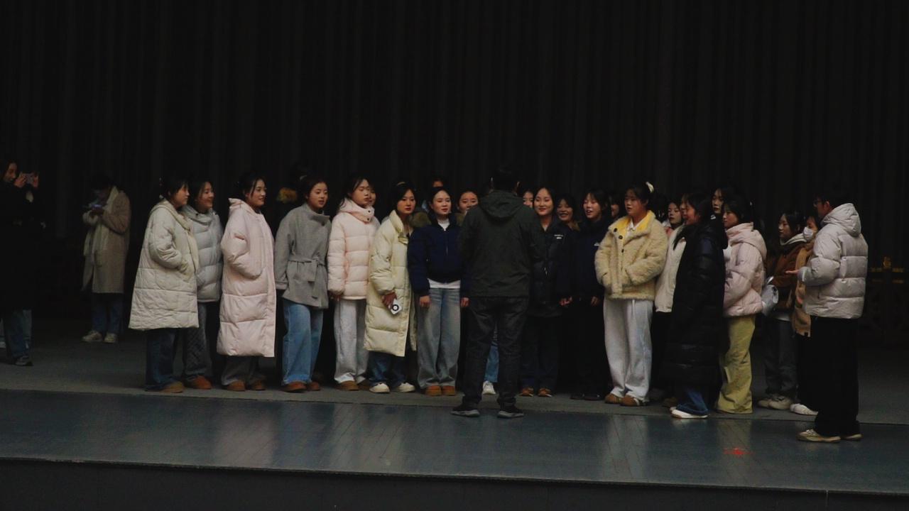 一進入劇院,隴劇演員們正在進行的化妝環節便吸引了同學們的目光。在化妝師的巧手下,旦角的高髻燕尾頭飾漸次成型,借鑒敦煌壁畫唐代發式的獨特發髻搭配素凈繡邊的服飾,打破了傳統戲曲的程式化格局;而生角的簡約妝容、凈角的濃墨重彩,每一筆都精準展現不同角色的性格特點。“原來隴劇的化妝不僅是美化,更在傳承皮影鏤空彩繪的藝術風格。”教育系學生張潤平一邊記錄一邊感嘆。演員們詳細講解了不同行當的妝容講究,從底色暈染到眉眼刻畫,無不體現著隴劇“以形傳神”的藝術追求。