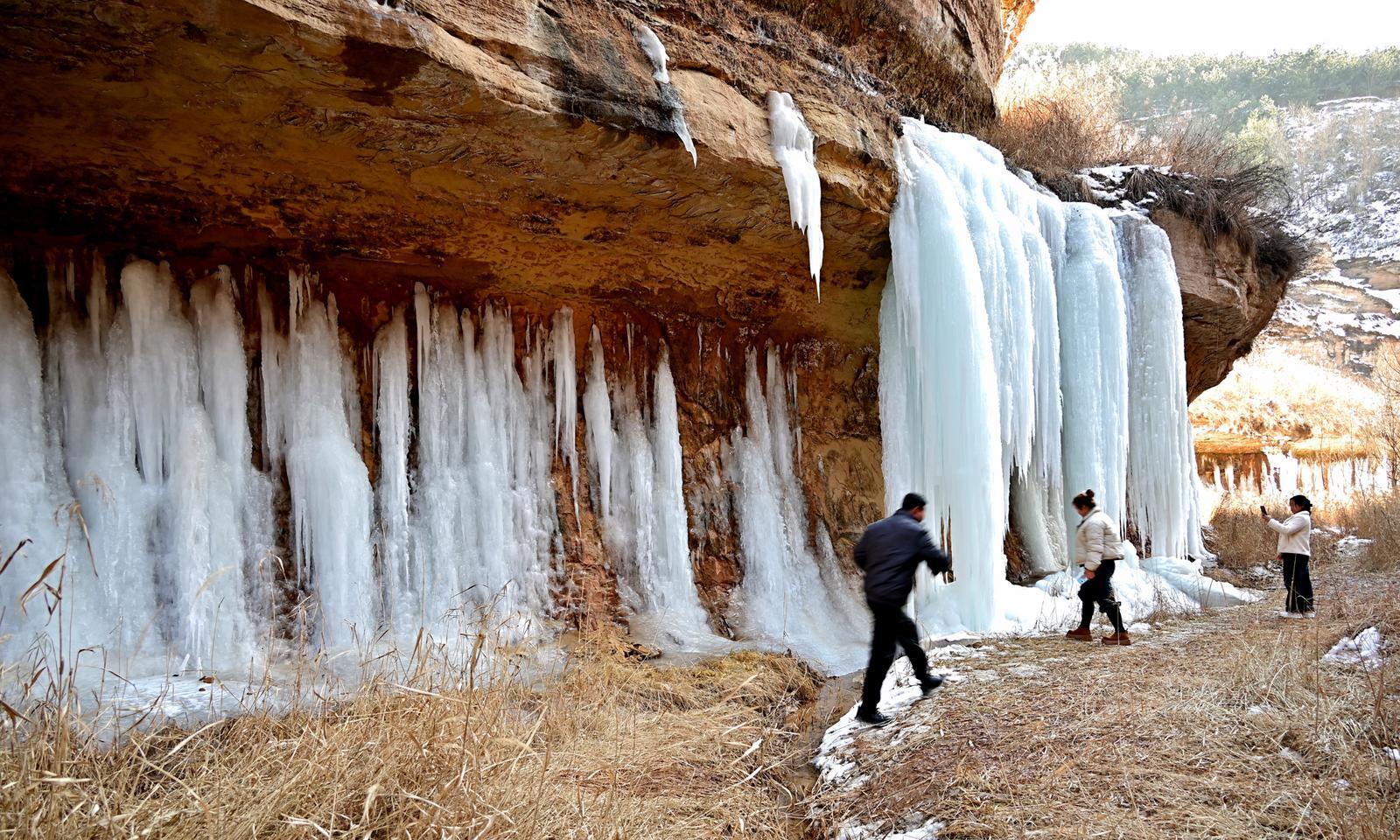 游客觀賞拍攝冰瀑美景。