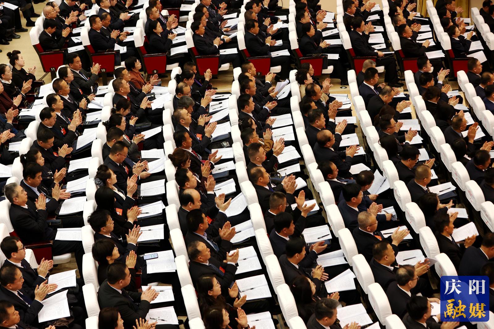會場氣氛莊重熱烈,主席臺帷幕正中的國徽與兩側鮮艷的紅旗交相輝映。二樓眺臺上“高舉偉大旗幟,匯集民智擔當,同心奮進譜寫中國式現代化慶陽實踐新篇章”的標語醒目突出,傳遞出奮進新征程的堅定信心。
