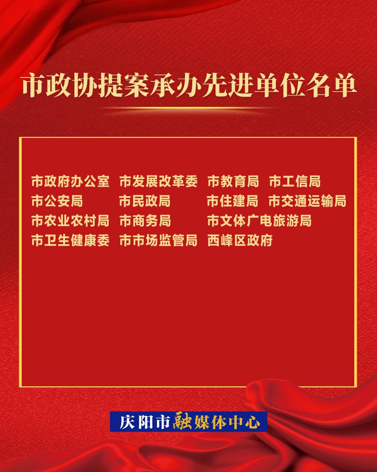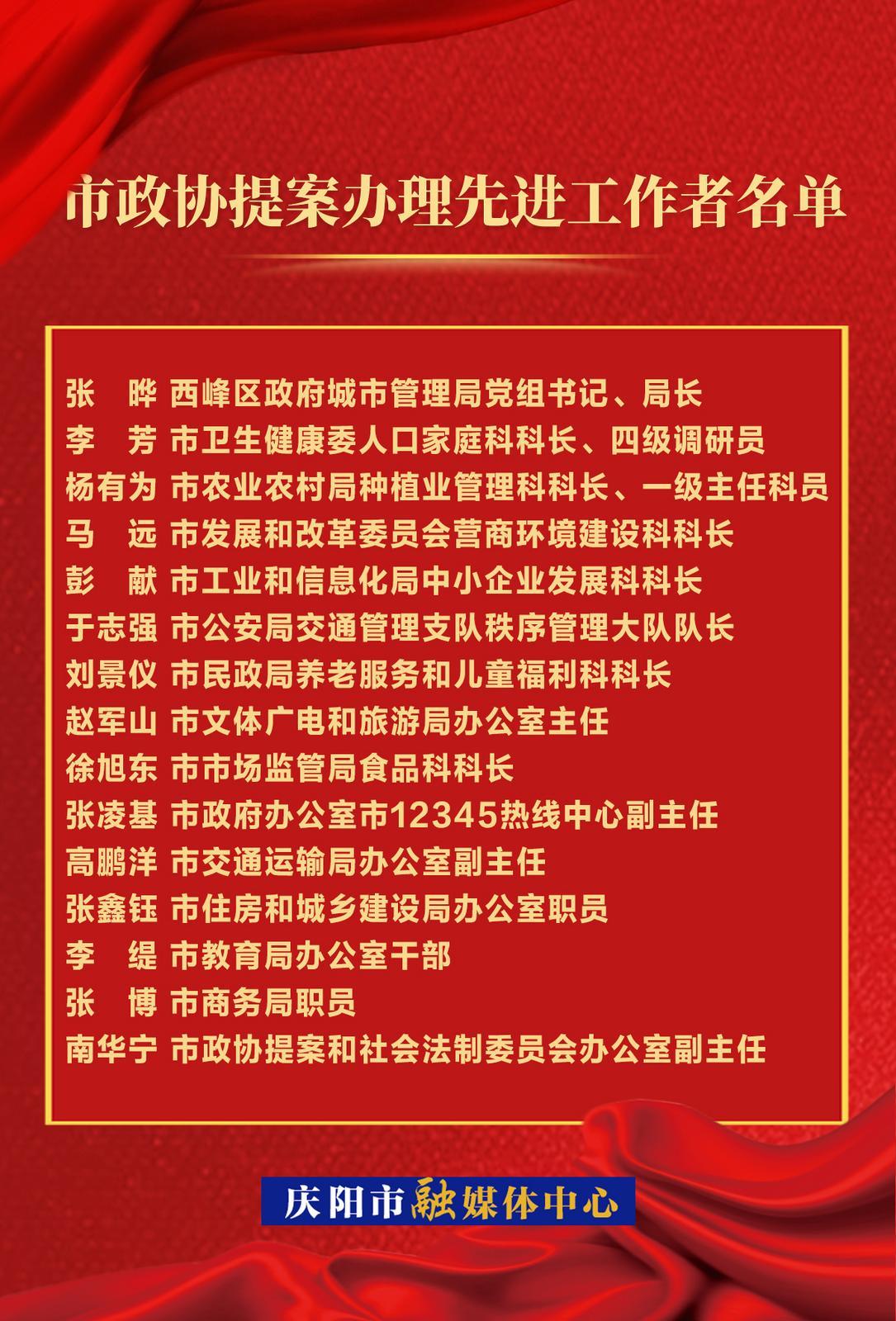 為表揚先進、樹立典型,激勵全市政協系統和廣大政協委員在新征程上再創佳績、再立新功,經市政協五屆五十一次主席會議研究決定,對侯彩梅等60名市政協委員;市政府辦公室等14個提案承辦先進單位,張曄等15名提案辦理先進工作者,《關于加強馬蓮河流域河床淤泥清理及生態治理的提案》等18件優秀提案;正寧縣政協等4個社情民意信息工作先進單位,荔小強等11名社情民意信息工作先進個人,《關于推廣和支持慶陽市“三元雙向”循環農業發展模式的建議》等10篇優秀社情民意信息,予以通報表揚。