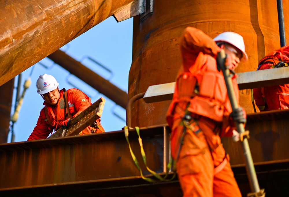 2026年2月13日,工人在位于渤海中部海域的渤中26-6油田開發項目(二期)作業現場施工。新華社記者 趙子碩 攝