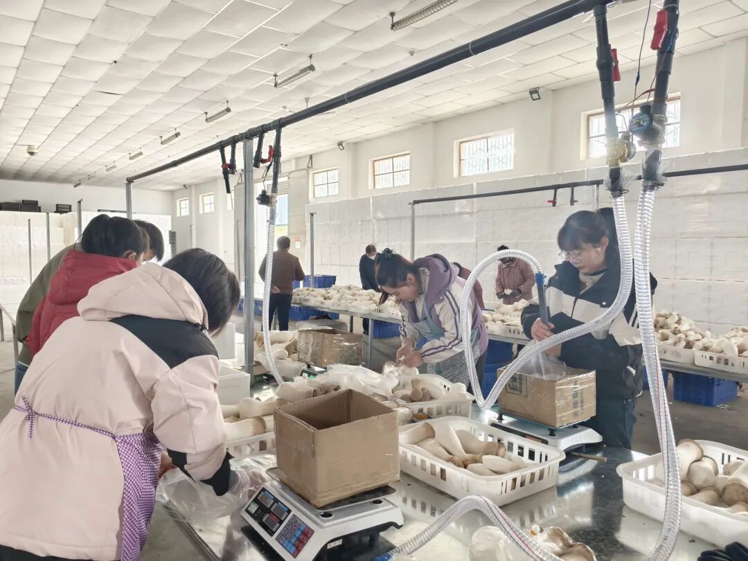 走進標準化養菇房,撲面而來的是溫潤的菌香與蓬勃的生機。工人們嫻熟地穿梭于整齊的菌架之間,手法輕柔地將達到采收標準的杏鮑菇采摘入筐,隨后迅速轉入分揀、修整、稱重、包裝等流水作業線。各環節銜接緊密,配合默契,現場繁忙而有序,大家正全力以赴搶抓最佳采收期,確保將這口“春日鮮”以最優的品質、最快的速度送達消費者的餐桌。