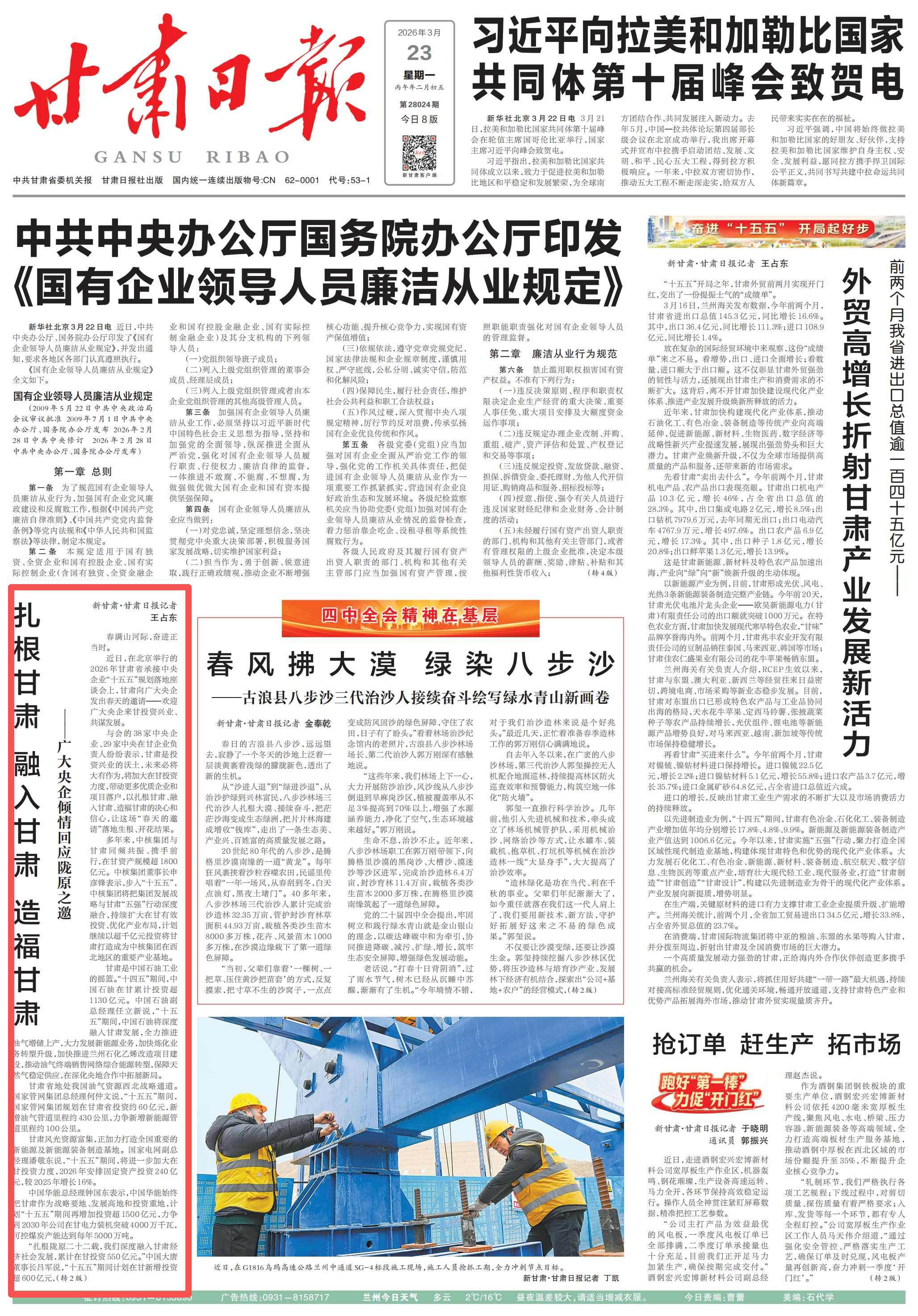 廣大央企是甘肅經濟社會高質量發展的重要引擎。一句句有力回應,一項項發展謀劃,飽含著對隴原大地的深情厚誼,展現出看好甘肅、投資甘肅的堅定態度和戰略眼光。