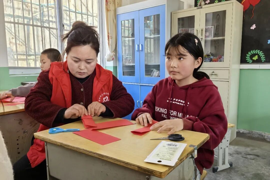 活動現場,春榮鎮本土非遺傳承人楊鵬飛耐心細致地向孩子們講解剪紙的歷史淵源、基本技法和文化寓意,從折紙的步驟到下剪的力度,從紋樣的設計到細節的處理,一步步手把手示范指導。“愛心爸爸”和“愛心媽媽”們紛紛化身“助教”,圍坐在孩子身邊,用溫暖陪伴鼓勵孩子們大膽創作。