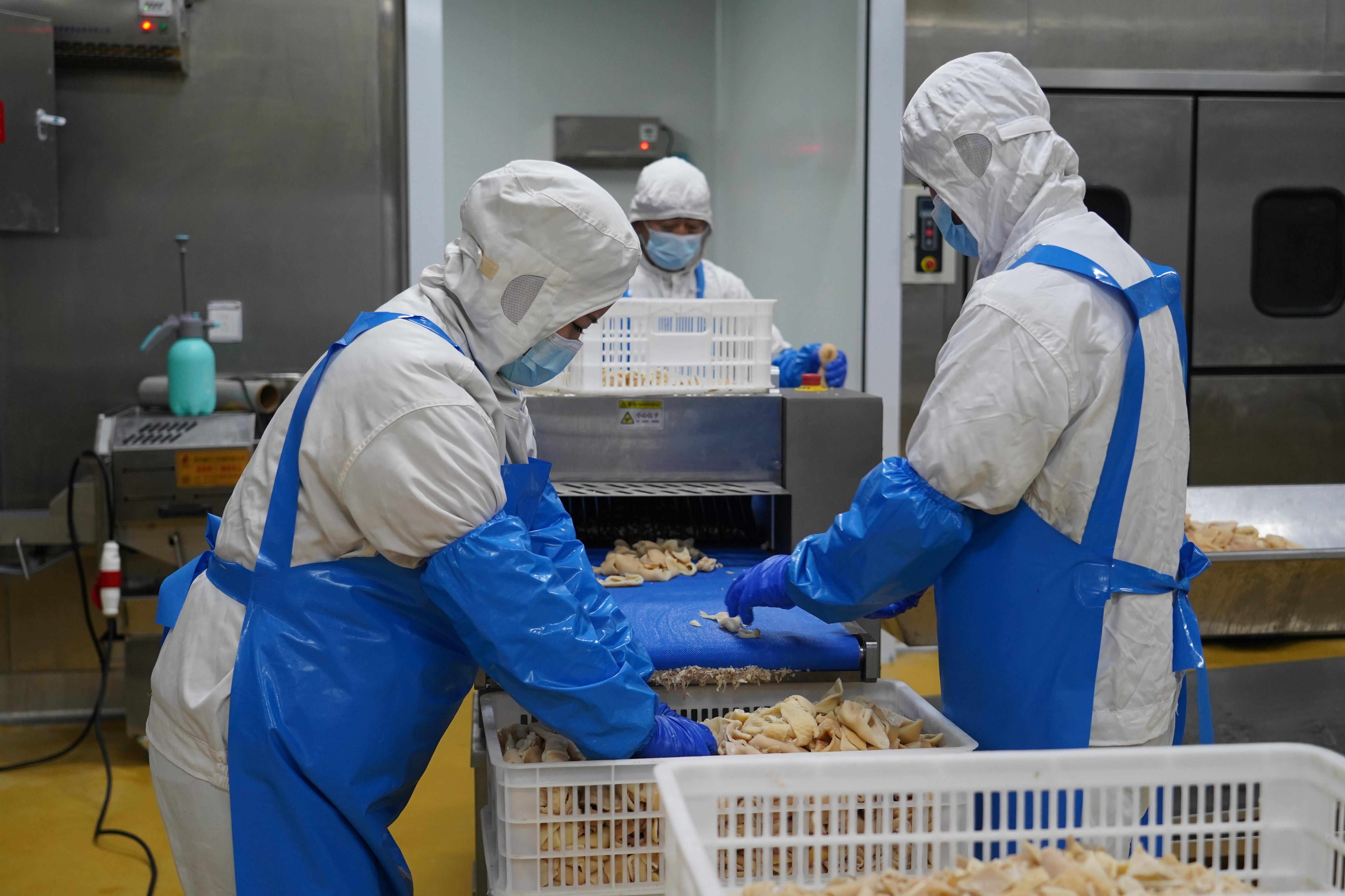 熟制車間內,10余名工人身著統一工裝,在各個工位上有序忙碌著。從解凍、蒸煮、預冷、切割到內包……經過約10個小時的精心加工,一箱箱羊雜產品便生產完成,即將發往全國各地。