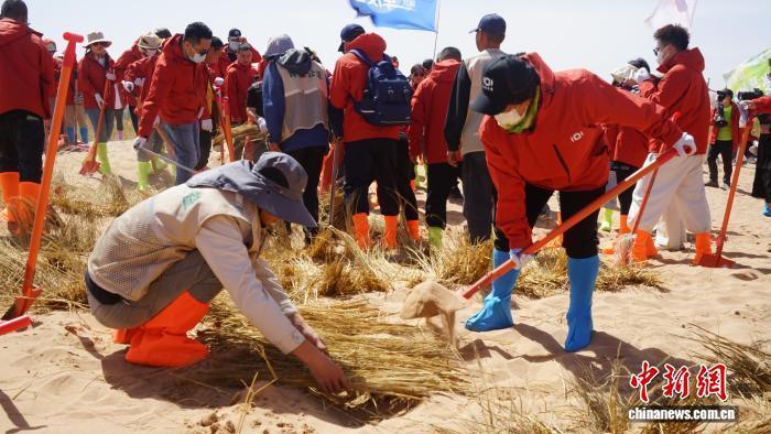 圖為民眾協作揮锨“種植”草方格沙障固沙壓沙。陳媛 攝